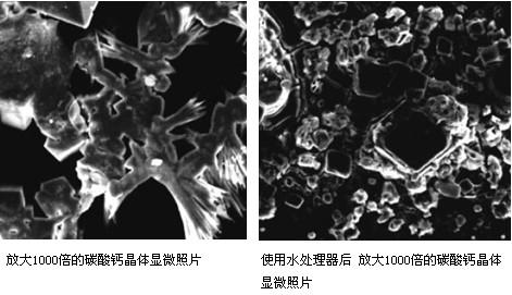 『量子水處理器』產(chǎn)生的干擾和共振使得物質(zhì)的微觀特性發(fā)生改變,以水垢中最常見的碳酸鈣為例,循環(huán)冷卻水中含有大量的重碳酸鈣,因發(fā)生如下反應而形成碳酸鈣垢: